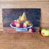 Antique small painting on wooden board, pears and fruit in scalloped bowl. Charming still life for a kitchen ledge or small space and with great colors. Size of board is 15" x 10".